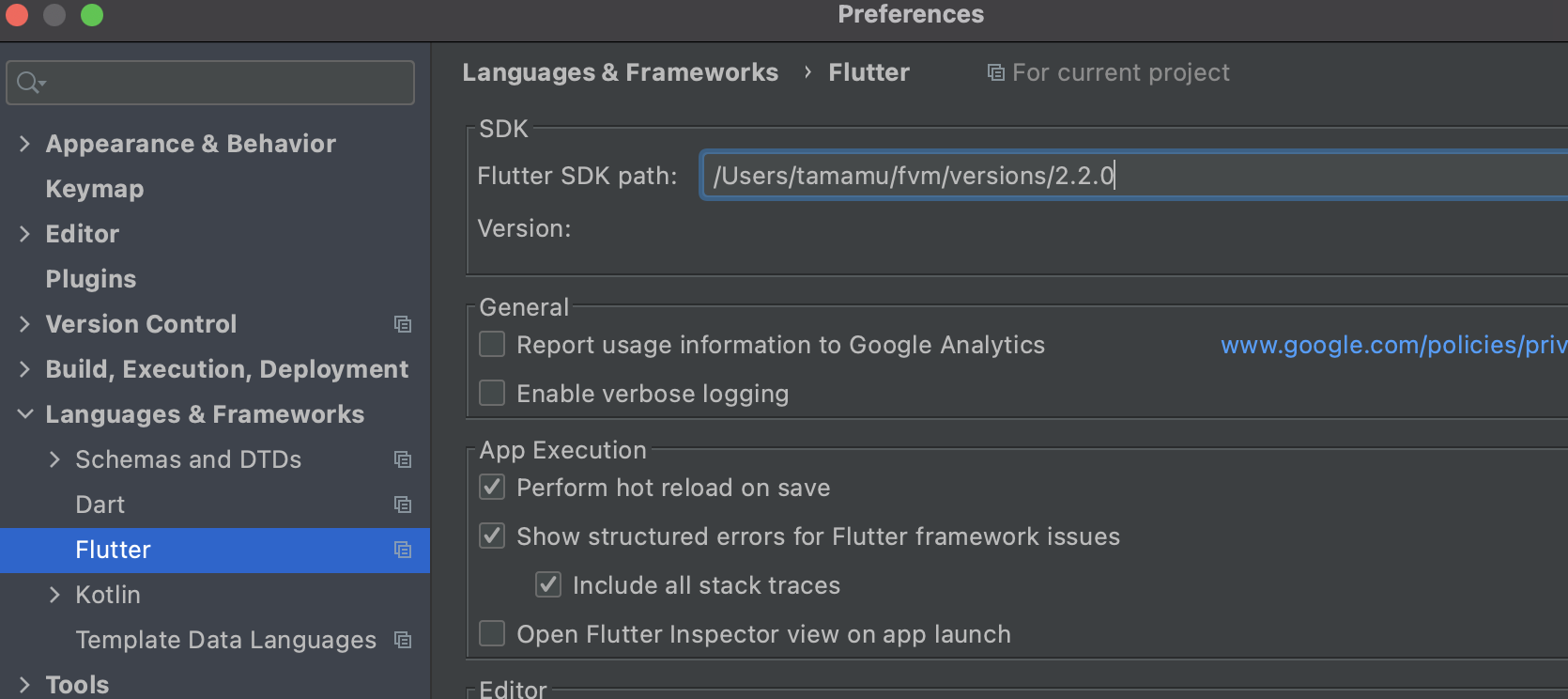 Preferences -> Languages & Frameworks -> Flutter -> SDKに上記のインストール先のパスを設定します。
