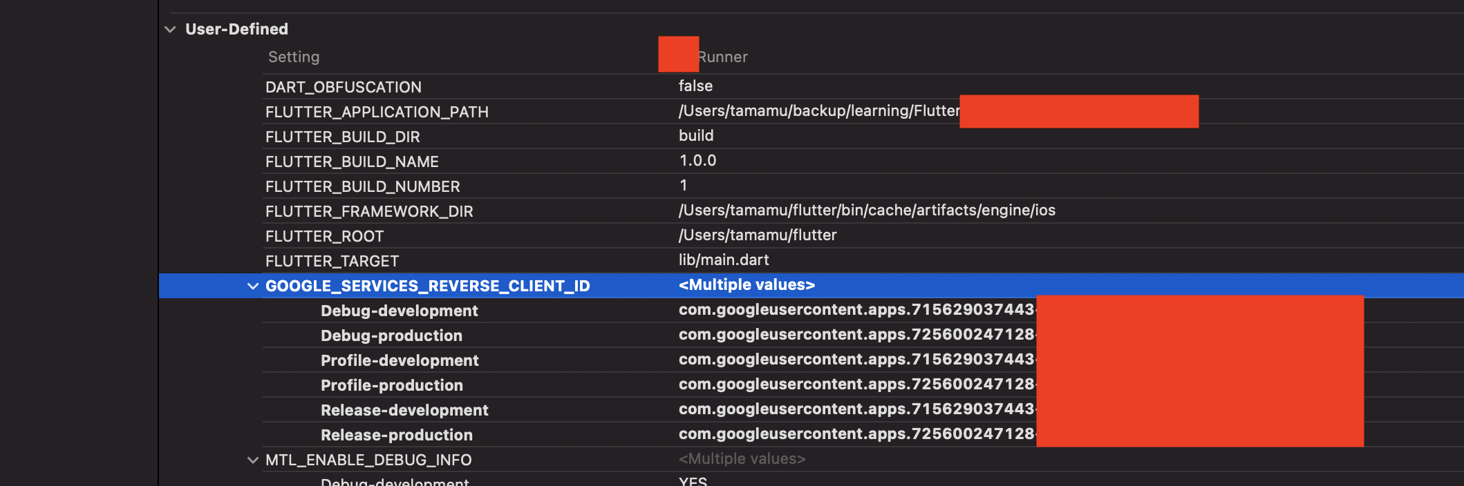 Targets > Runner > Build Settings > Search “user” > User-Defined > GOOGLE_SERVICES_REVERSE_CLIENT_ID