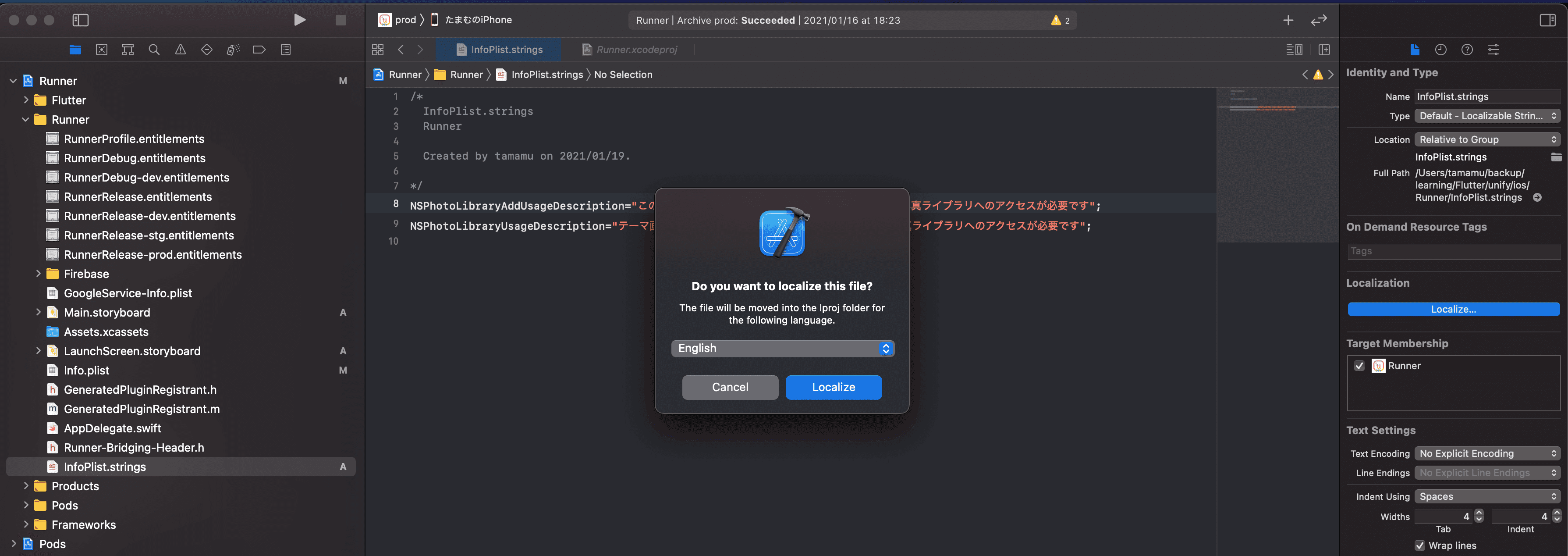 Flutterのiosシステムダイアログの文言をローカライズする方法