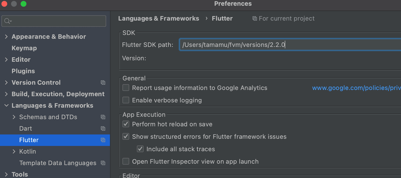 Preferences -> Languages & Frameworks -> Flutter -> SDKに上記のインストール先のパスを設定します。
